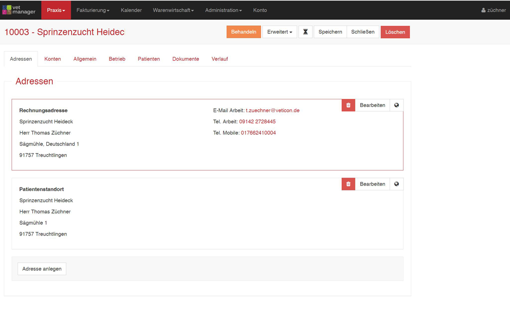Erfassen Sie mehrere Adressen zu Ihren Kunden, z.B. Rechnungsadresse und Patientenstandort. Mit einem Klick können Sie den Routenplaner zur Navigation in Google Maps öffnen.