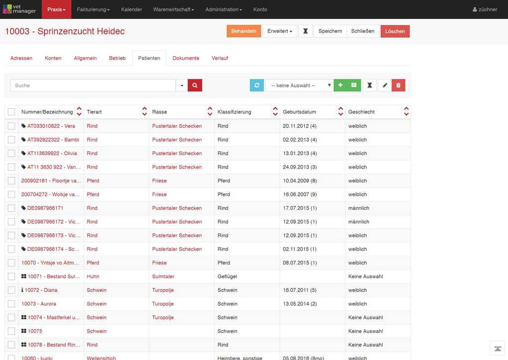 In der Patientenliste können Sie individuell filtern, z.B. nach Tierart, Namen oder Chipnummern suchen. Sie behalten stets den Überblick, auch bei großen Beständen. Selbstverständlich aktualisieren Sie die Rinderbestände mit einem Klick über die Hi-Tier inkl. der Gesundheitsdaten des Bestandsregisters und Namen sofern vom Tierhalter eingepflegt.