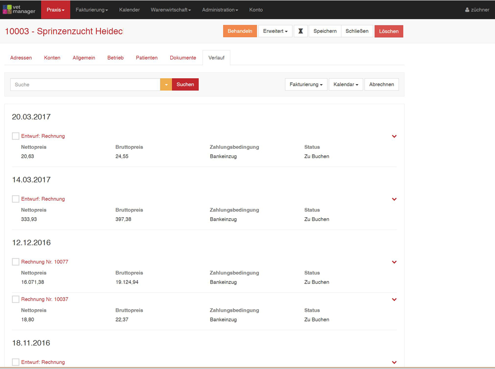 Von hier aus können Sie ebenfalls Dokumente erstellen und direkt per Email an den Kunden versenden. Selbstverständlich haben Sie ebenfalls einen schnellen Überblick über alle Dokumente der Patienten des Kunden sowie Rechnungen und deren Zahlungsstatus.